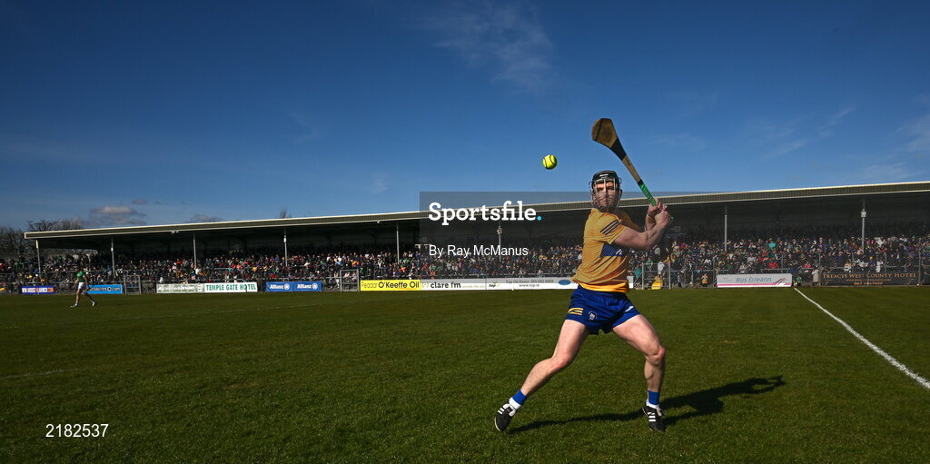 6 March 2022; Tony Kelly of Clare takes a practice free before the Allianz Hurling League Division 1 Group A match between Clare and Limerick at Cusack Park in Ennis, Clare. Photo by Ray McManus/Sportsfile