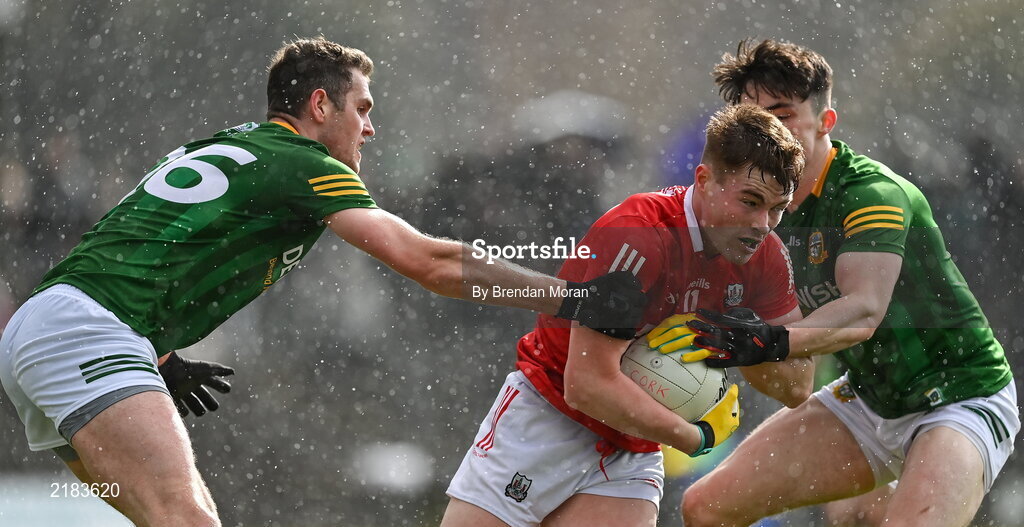 13 March 2022; Fionn Herlihy of Cork in action against Brian Menton, left, and Eoin Harkin of Meath during the Allianz Football League Division 2 match between Meath and Cork at Páirc Táilteann in Navan, Meath. Photo by Brendan Moran/Sportsfile