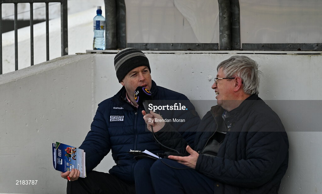 13 March 2022; Cork County Board chairman Marc Sheehan is interviewed by Michael Scanlon of C103 radio station after the Allianz Football League Division 2 match between Meath and Cork at Páirc Táilteann in Navan, Meath. Photo by Brendan Moran/Sportsfile