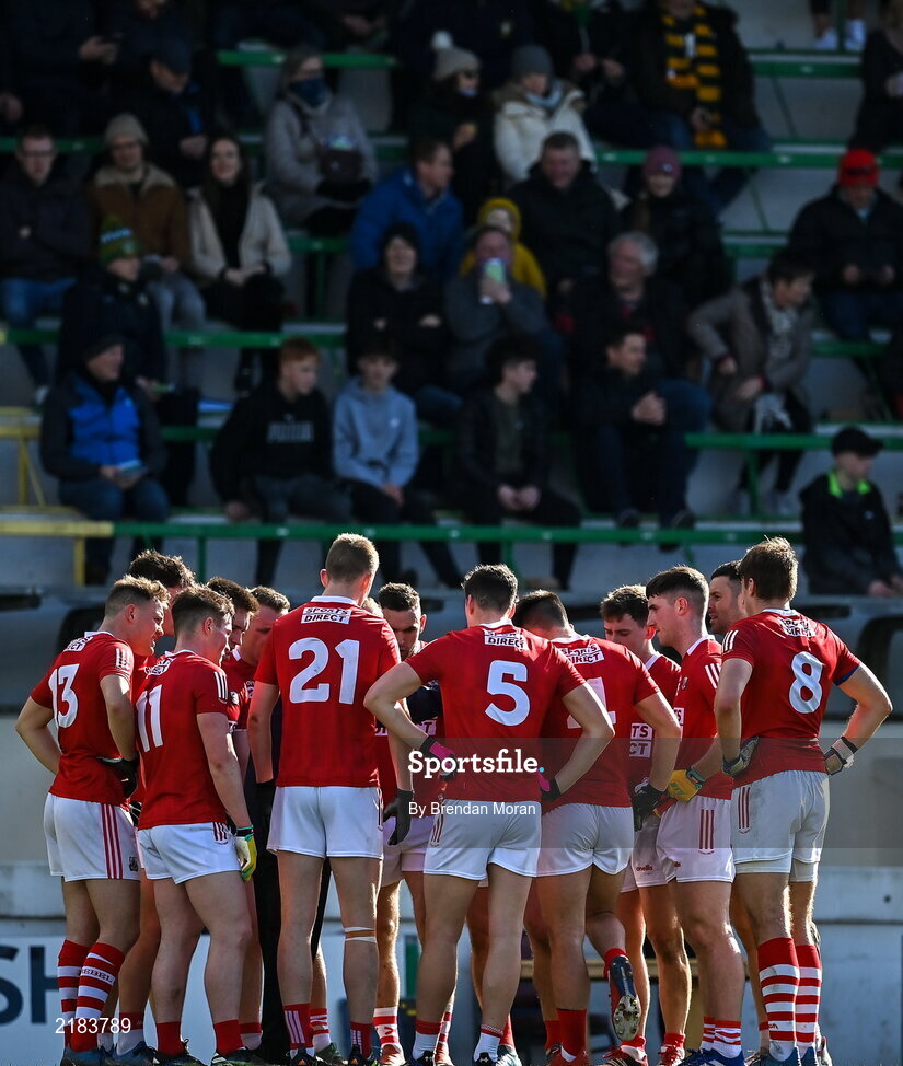 13 March 2022; The Cork team huddle at half-time in the Allianz Football League Division 2 match between Meath and Cork at Páirc Táilteann in Navan, Meath. Photo by Brendan Moran/Sportsfile