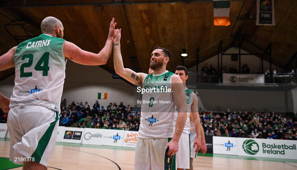 27 February 2022; Ireland captain Kyle Hosford high fives teammate Keelan Cairns as he is introduced before the FIBA EuroBasket 2025 Pre-Qualifiers First Round Group A match between Ireland and Cyprus at the National Basketball Arena in Tallaght, Dublin. Photo by Brendan Moran/Sportsfile