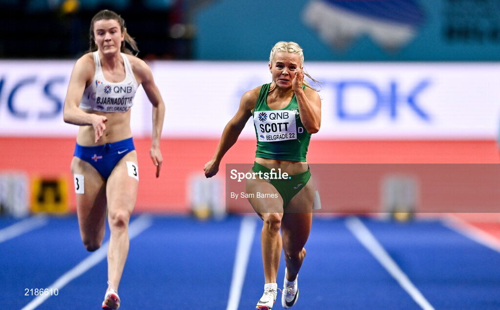18 March 2022; Molly Scott of Ireland, right, alongside Guðbjörg Jóna Bjarnadóttir of Iceland, competing in the women's 60m during day one of the World Indoor Athletics Championships at the Štark Arena in Belgrade, Serbia. Photo by Sam Barnes/Sportsfile