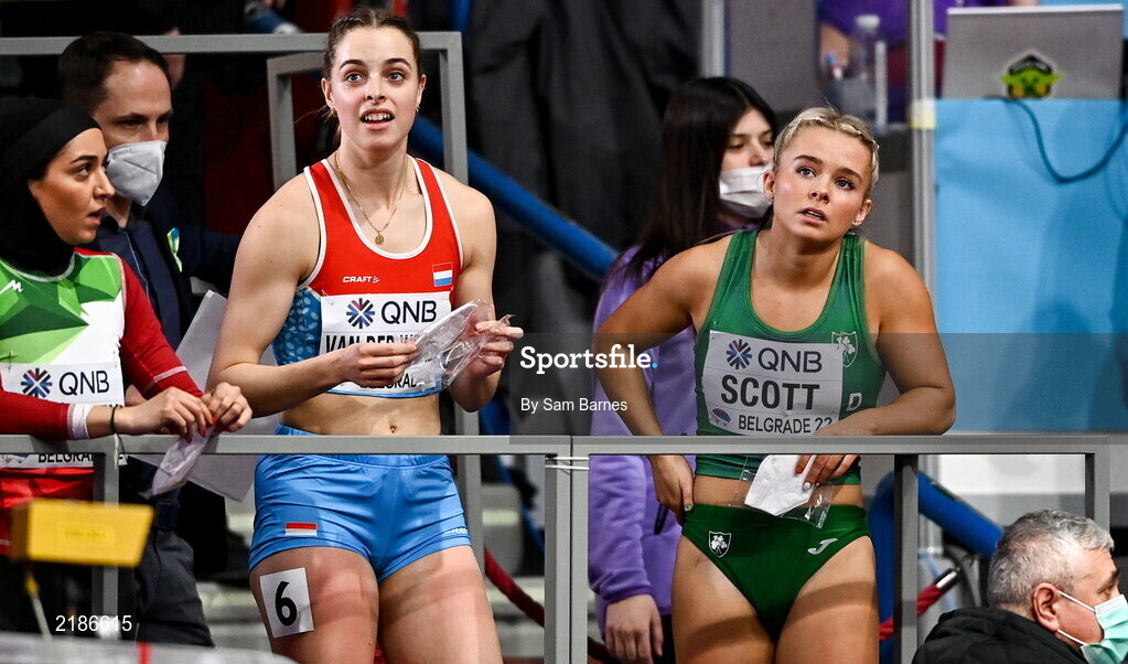 18 March 2022; Molly Scott of Ireland, right, after competing in the women's 60m during day one of the World Indoor Athletics Championships at the Štark Arena in Belgrade, Serbia. Photo by Sam Barnes/Sportsfile
