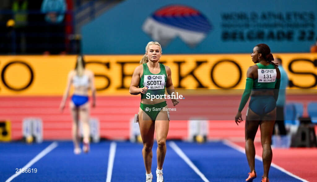 18 March 2022; Molly Scott of Ireland before competing in the women's 60m during day one of the World Indoor Athletics Championships at the Štark Arena in Belgrade, Serbia. Photo by Sam Barnes/Sportsfile