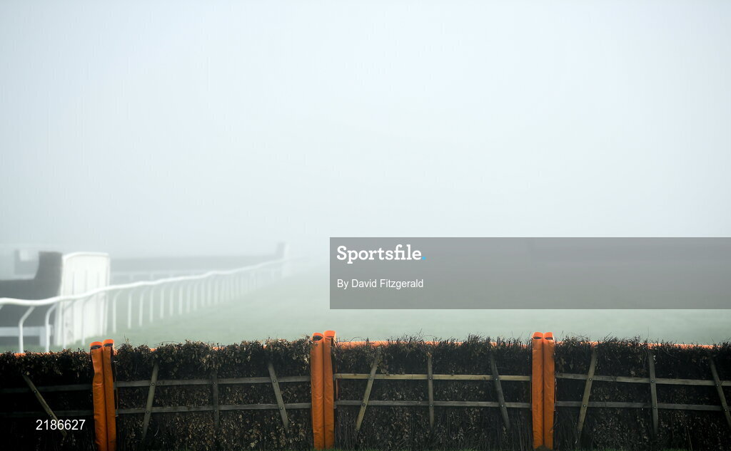 18 March 2022; The final hurdle is seen amidst heavy fog prior to racing on day four of the Cheltenham Racing Festival at Prestbury Park in Cheltenham, England. Photo by David Fitzgerald/Sportsfile