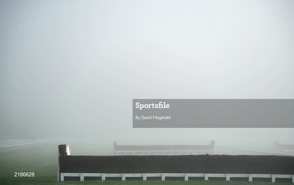18 March 2022; The final hurdle is seen amidst heavy fog prior to racing on day four of the Cheltenham Racing Festival at Prestbury Park in Cheltenham, England. Photo by David Fitzgerald/Sportsfile