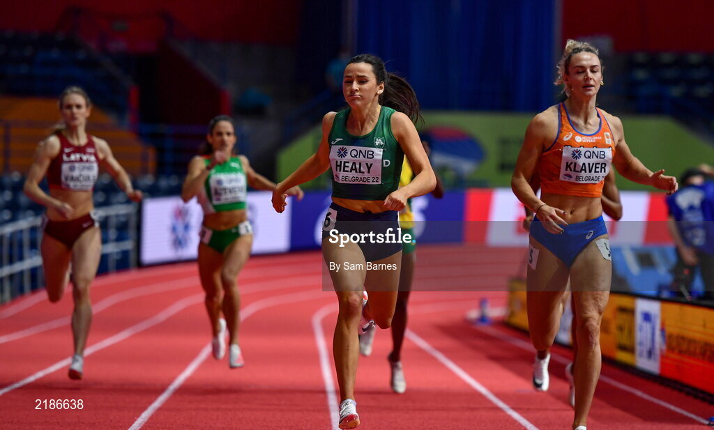 18 March 2022; Phil Healy of Ireland, centre, crosses the line to win her heat in the women's 400m, ahead of Lieke Klaver of Netherlands, right, who finished second, during day one of the World Indoor Athletics Championships at the Štark Arena in Belgrade, Serbia. Photo by Sam Barnes/Sportsfile