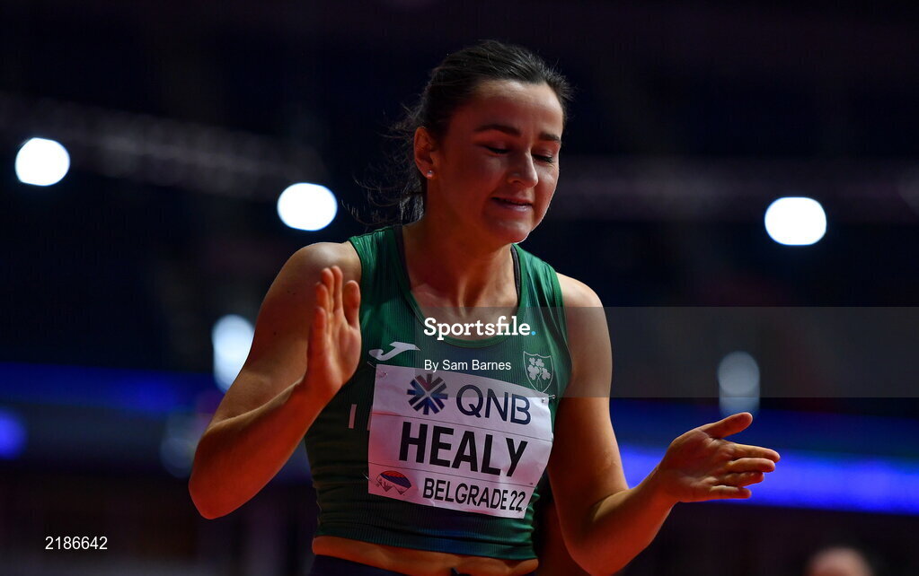 18 March 2022; Phil Healy of Ireland celebrates after winning her heat in the women's 400m during day one of the World Indoor Athletics Championships at the Štark Arena in Belgrade, Serbia. Photo by Sam Barnes/Sportsfile