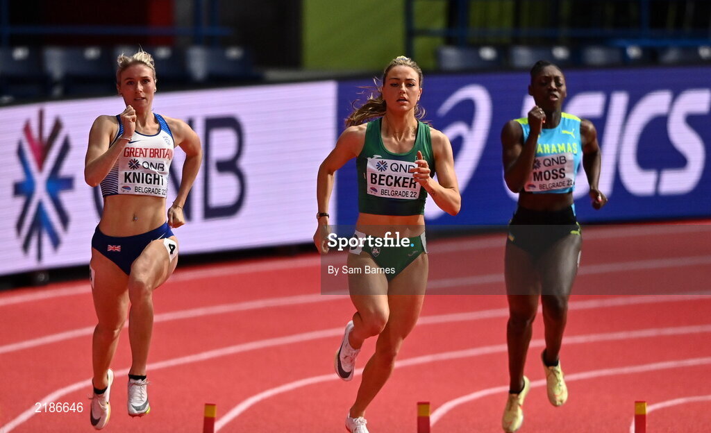 18 March 2022; Sophie Becker of Ireland, centre, competing in the women's 400m heats during day one of the World Indoor Athletics Championships at the Štark Arena in Belgrade, Serbia. Photo by Sam Barnes/Sportsfile