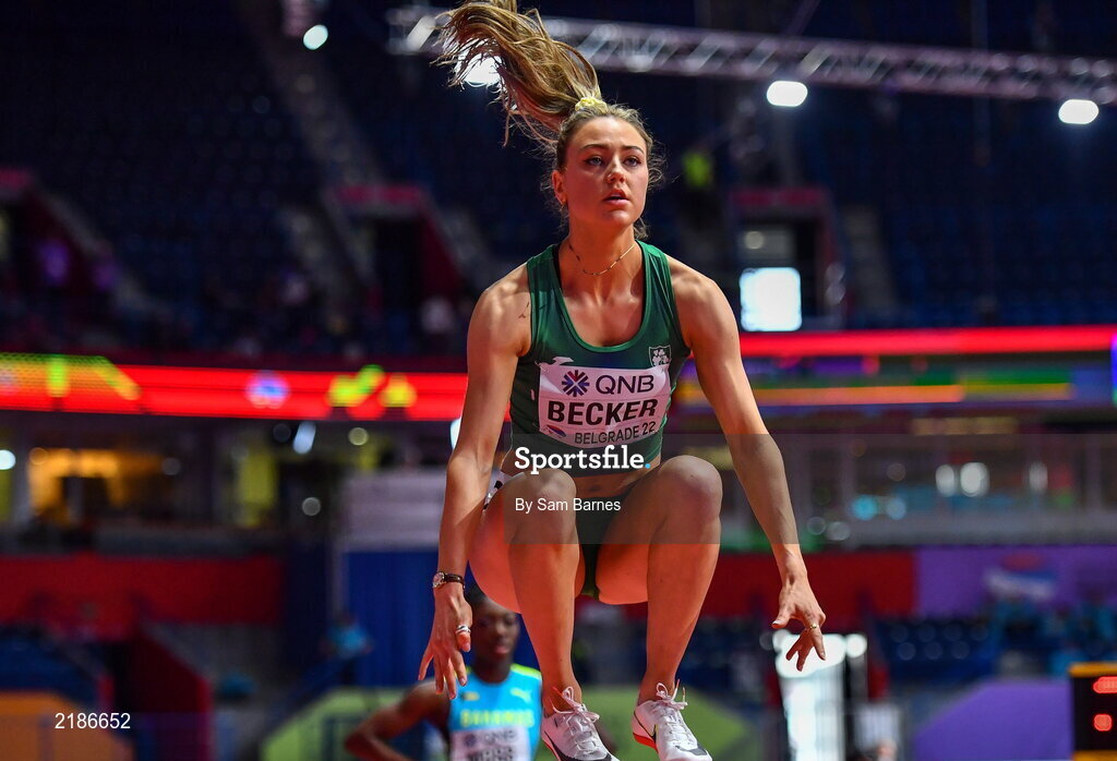 18 March 2022; Sophie Becker of Ireland before competing in the women's 400m heats during day one of the World Indoor Athletics Championships at the Štark Arena in Belgrade, Serbia. Photo by Sam Barnes/Sportsfile