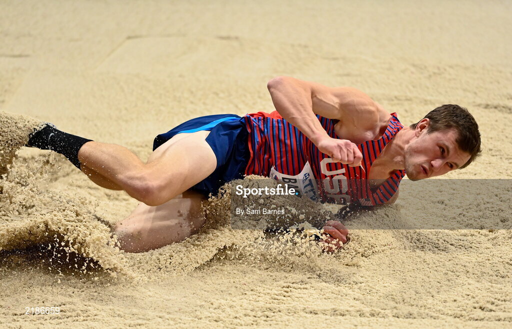 18 March 2022; Steven Bastien of USA competing in the long jump of men's heptathlon during day one of the World Indoor Athletics Championships at the Štark Arena in Belgrade, Serbia. Photo by Sam Barnes/Sportsfile