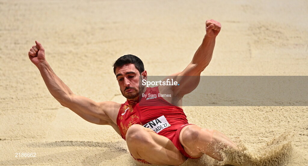 18 March 2022; Jorge Ureña of Spain competing in the long jump of men's heptathlon during day one of the World Indoor Athletics Championships at the Štark Arena in Belgrade, Serbia. Photo by Sam Barnes/Sportsfile