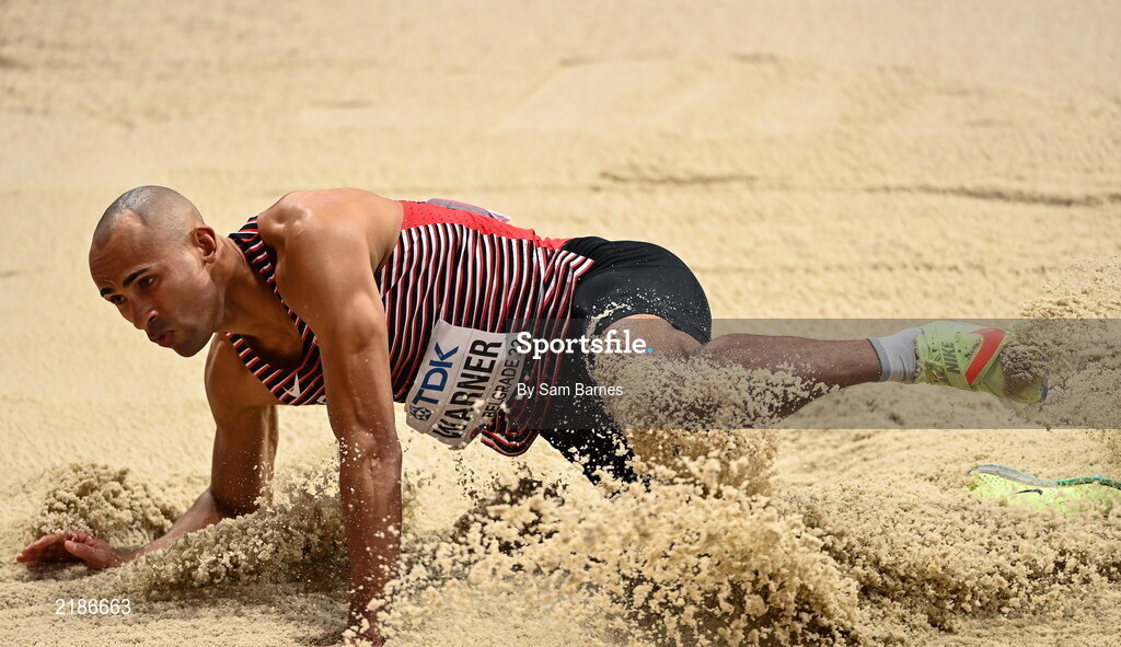18 March 2022; Damian Warner of Canada competing in the long jump of men's heptathlon during day one of the World Indoor Athletics Championships at the Štark Arena in Belgrade, Serbia. Photo by Sam Barnes/Sportsfile