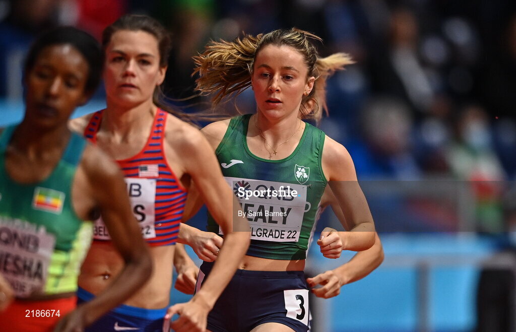 18 March 2022; Sarah Healy of Ireland, right, competing in the women's 1500m during day one of the World Indoor Athletics Championships at the Štark Arena in Belgrade, Serbia. Photo by Sam Barnes/Sportsfile