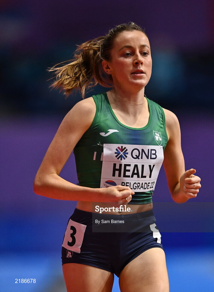 18 March 2022; Sarah Healy of Ireland competing in the women's 1500m during day one of the World Indoor Athletics Championships at the Štark Arena in Belgrade, Serbia. Photo by Sam Barnes/Sportsfile