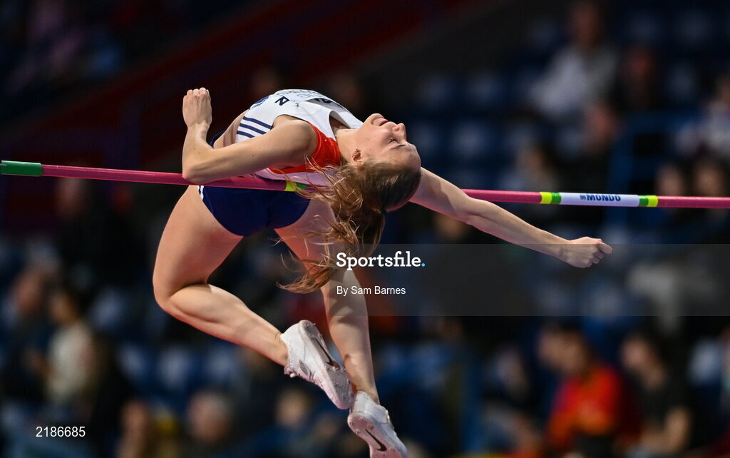 18 March 2022; Léonie Cambours of France competing in the high jump of the women's pentathlon during day one of the World Indoor Athletics Championships at the Štark Arena in Belgrade, Serbia. Photo by Sam Barnes/Sportsfile