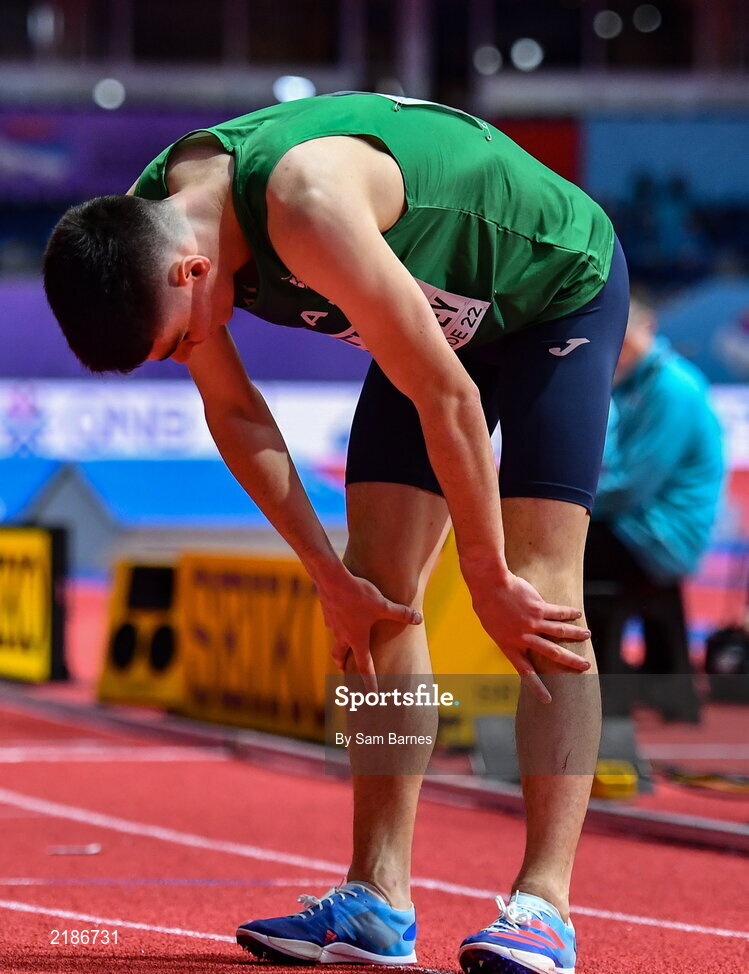 18 March 2022; Darragh McElhinney of Ireland reacts after competing in the men's 3000m during day one of the World Indoor Athletics Championships at the Štark Arena in Belgrade, Serbia. Photo by Sam Barnes/Sportsfile