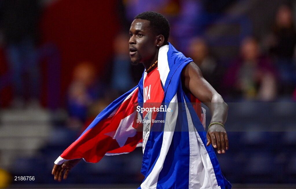 18 March 2022; Lázaro Martínez of Cuba, celebrates winning the men's triple jump during day one of the World Indoor Athletics Championships at the Štark Arena in Belgrade, Serbia. Photo by Sam Barnes/Sportsfile