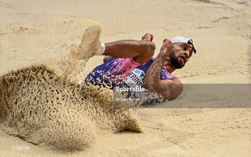 18 March 2022; Jahnhai Perinchief of Bermuda competing in the men's triple jump during day one of the World Indoor Athletics Championships at the Štark Arena in Belgrade, Serbia. Photo by Sam Barnes/Sportsfile