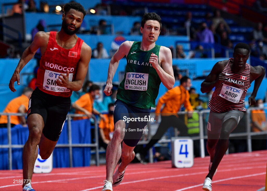 18 March 2022; Mark English of Ireland, centre, competing in the men's 800m heats during day one of the World Indoor Athletics Championships at the Štark Arena in Belgrade, Serbia. Photo by Sam Barnes/Sportsfile