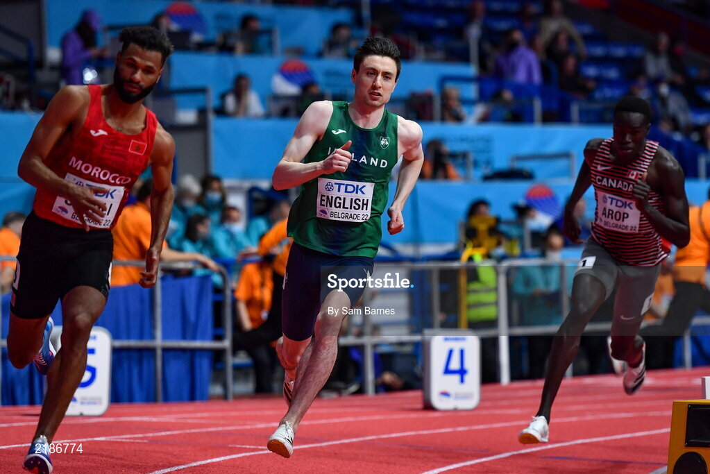 18 March 2022; Mark English of Ireland, centre, competing in the men's 800m heats during day one of the World Indoor Athletics Championships at the Štark Arena in Belgrade, Serbia. Photo by Sam Barnes/Sportsfile