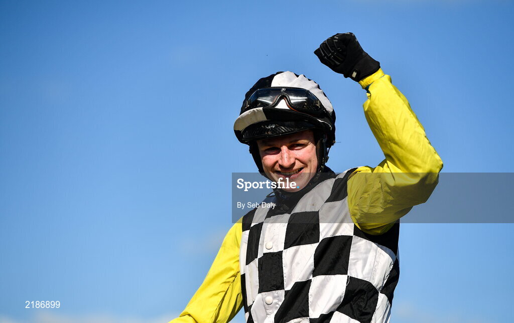 18 March 2022; Jockey Sean O'Keeffe on The Nice Guy after winning the Albert Bartlett Novices' Hurdle during day four of the Cheltenham Racing Festival at Prestbury Park in Cheltenham, England. Photo by Seb Daly/Sportsfile