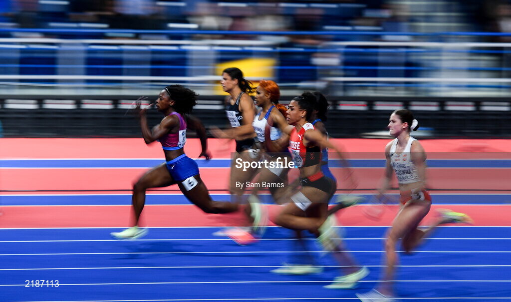 18 March 2022; Mikiah Brisco of USA, left, on her way to winning her women's 60m semi-final during day one of the World Indoor Athletics Championships at the Štark Arena in Belgrade, Serbia. Photo by Sam Barnes/Sportsfile