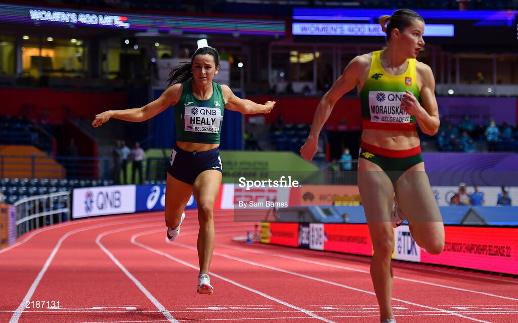 18 March 2022; Phil Healy of Ireland, left, crosses the line to finish sixth in her women's 400m semi-final during day one of the World Indoor Athletics Championships at the Štark Arena in Belgrade, Serbia. Photo by Sam Barnes/Sportsfile