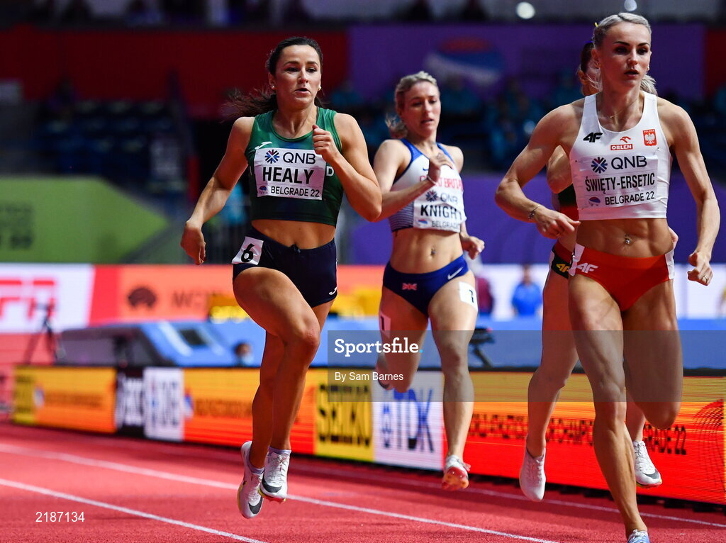 18 March 2022; Phil Healy of Ireland, left, competing in her women's 400m semi-final during day one of the World Indoor Athletics Championships at the Štark Arena in Belgrade, Serbia. Photo by Sam Barnes/Sportsfile