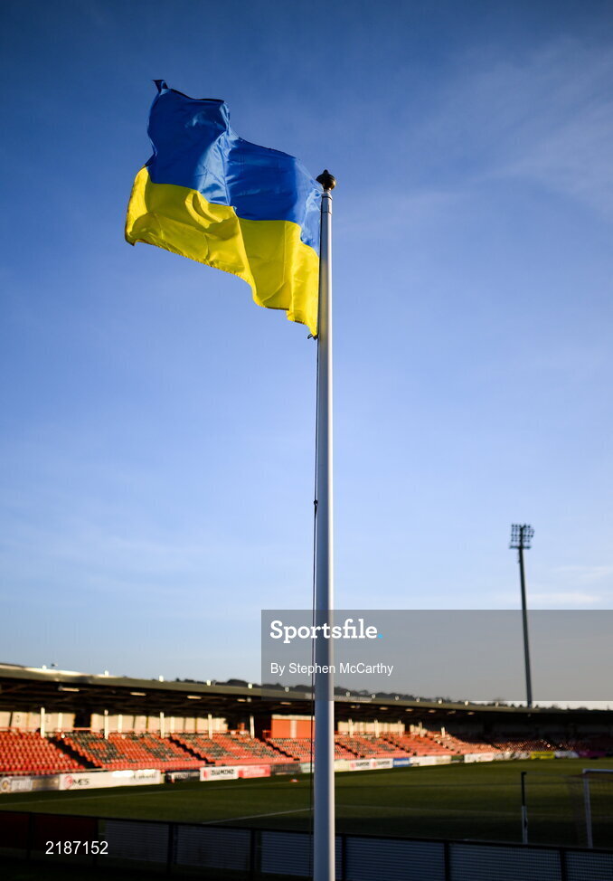 18 March 2022; The flag of Ukraine flies at The Ryan McBride Brandywell Stadium before the SSE Airtricity League Premier Division match between Derry City and St Patrick's Athletic at The Ryan McBride Brandywell Stadium in Derry. Photo by Stephen McCarthy/Sportsfile