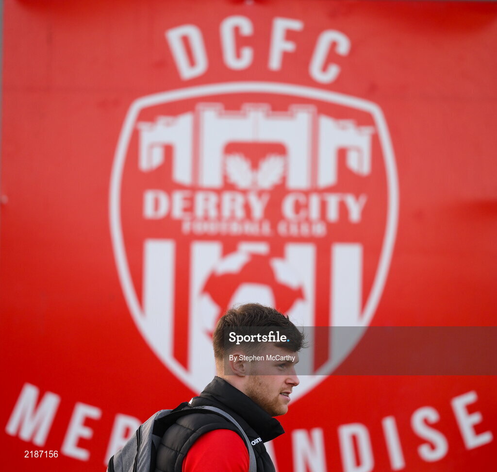 18 March 2022; Cameron McJannet of Derry City arrives for the SSE Airtricity League Premier Division match between Derry City and St Patrick's Athletic at The Ryan McBride Brandywell Stadium in Derry. Photo by Stephen McCarthy/Sportsfile