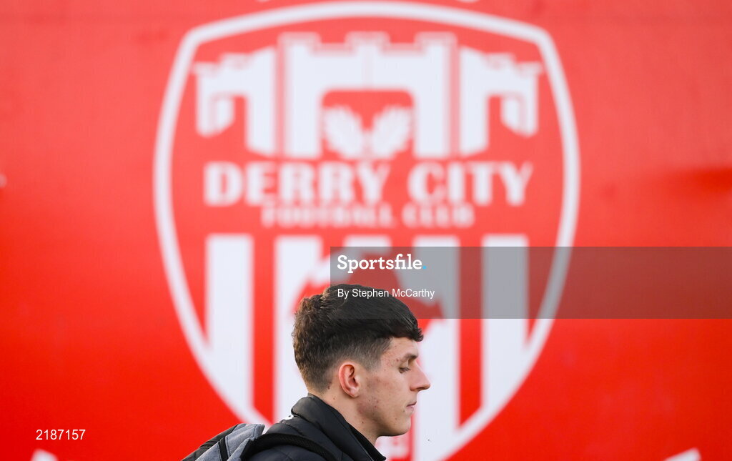 18 March 2022; Eoin Toal of Derry City arrives for the SSE Airtricity League Premier Division match between Derry City and St Patrick's Athletic at The Ryan McBride Brandywell Stadium in Derry. Photo by Stephen McCarthy/Sportsfile