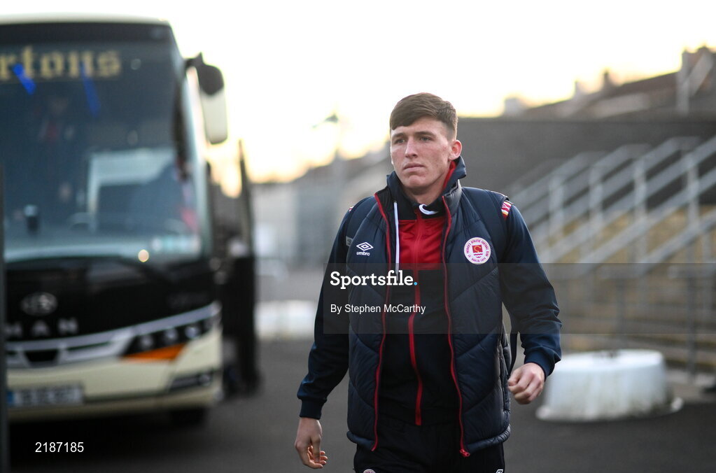 18 March 2022; Joe Redmond of St Patrick's Athletic arrives for the SSE Airtricity League Premier Division match between Derry City and St Patrick's Athletic at The Ryan McBride Brandywell Stadium in Derry. Photo by Stephen McCarthy/Sportsfile