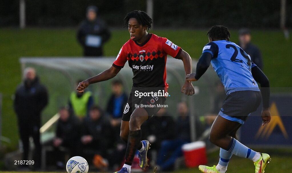 18 March 2022; Promise Omochere of Bohemians in action against Eric Yoro of UCD during the SSE Airtricity League Premier Division match between UCD and Bohemians at UCD Bowl in Belfield, Dublin. Photo by Brendan Moran/Sportsfile