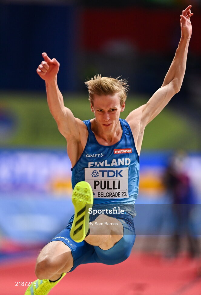 18 March 2022; Kristian Pulli of Finland competing in the men's long jump during day one of the World Indoor Athletics Championships at the Štark Arena in Belgrade, Serbia. Photo by Sam Barnes/Sportsfile