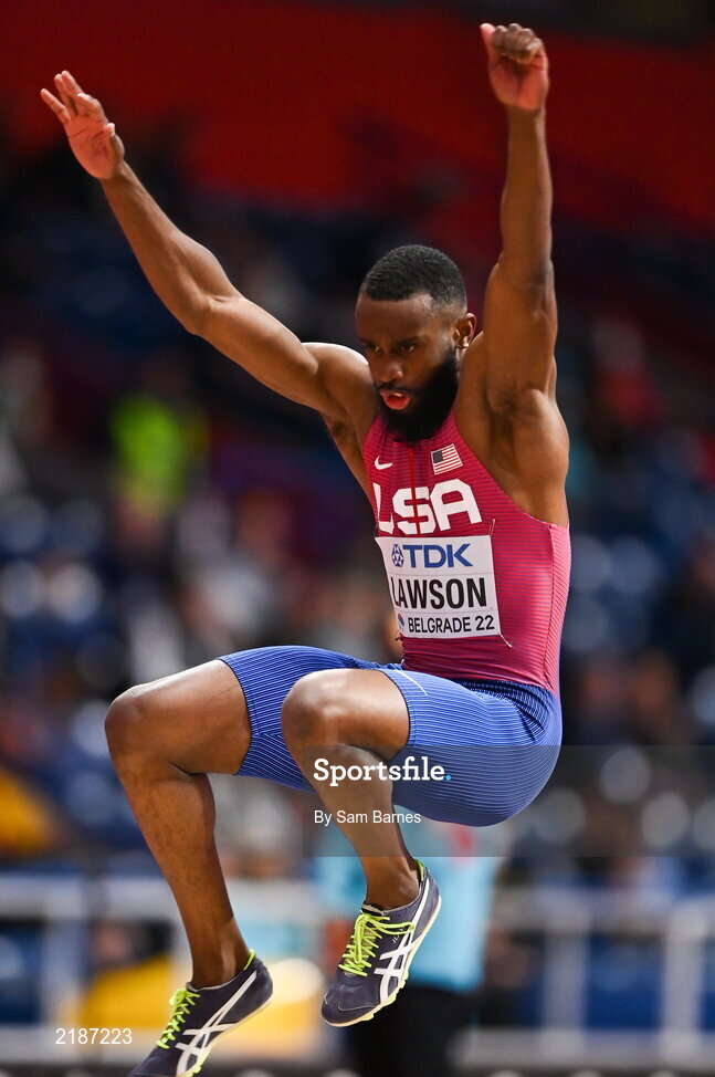 18 March 2022; Jarrion Lawson of USA competing in the men's long jump during day one of the World Indoor Athletics Championships at the Štark Arena in Belgrade, Serbia. Photo by Sam Barnes/Sportsfile
