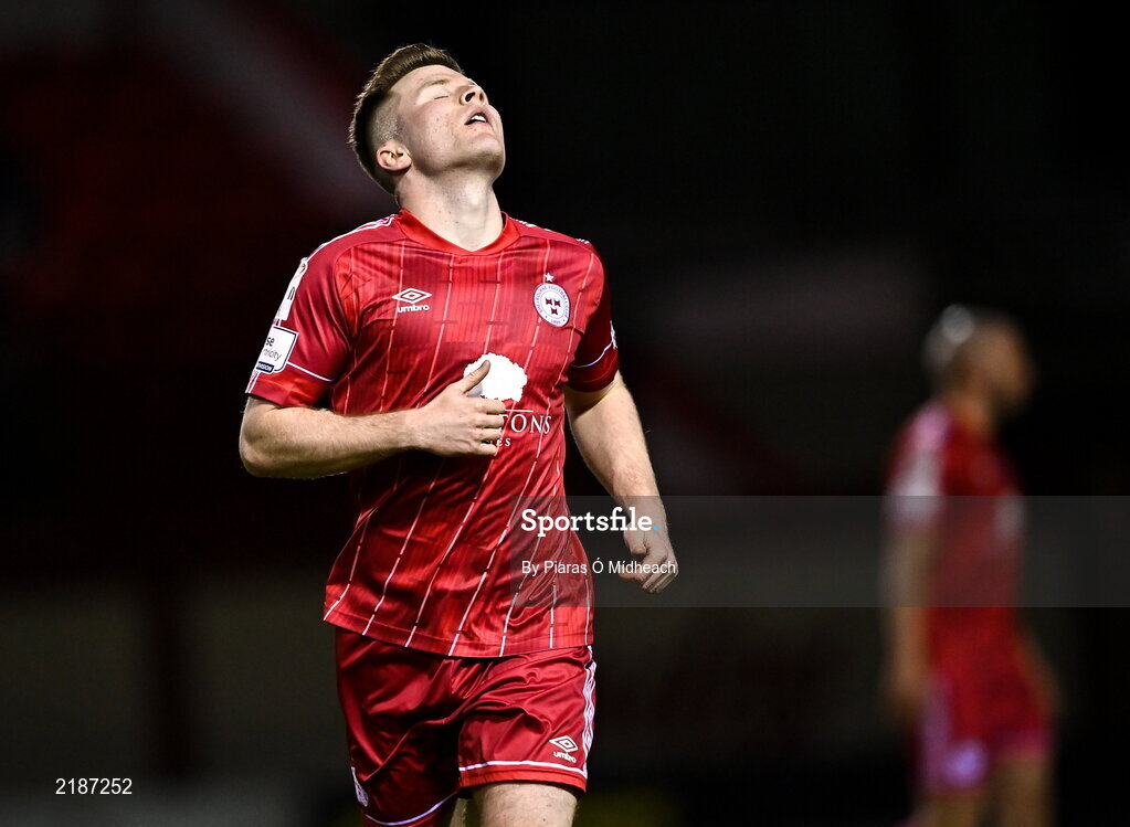 18 March 2022; Conor Kane of Shelbourne reacts after a missed chance for his side during the SSE Airtricity League Premier Division match between Shelbourne and Finn Harps at Tolka Park in Dublin. Photo by Piaras Ó Mídheach/Sportsfile