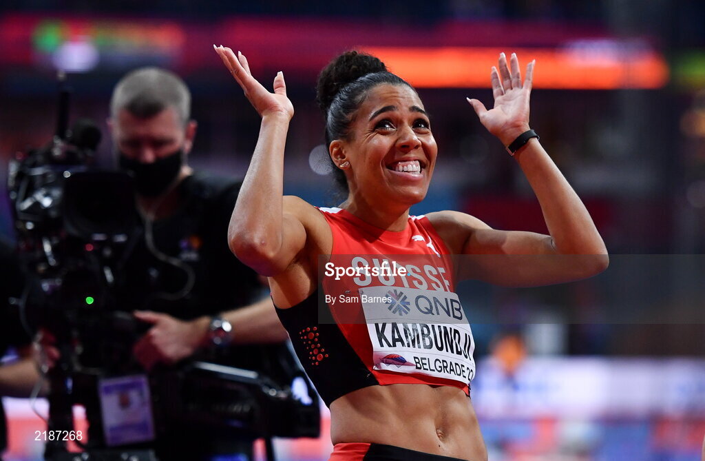 18 March 2022; Mujinga Kambundji of Switzerland celebrates winning the women's 60m final during day one of the World Indoor Athletics Championships at the Štark Arena in Belgrade, Serbia. Photo by Sam Barnes/Sportsfile