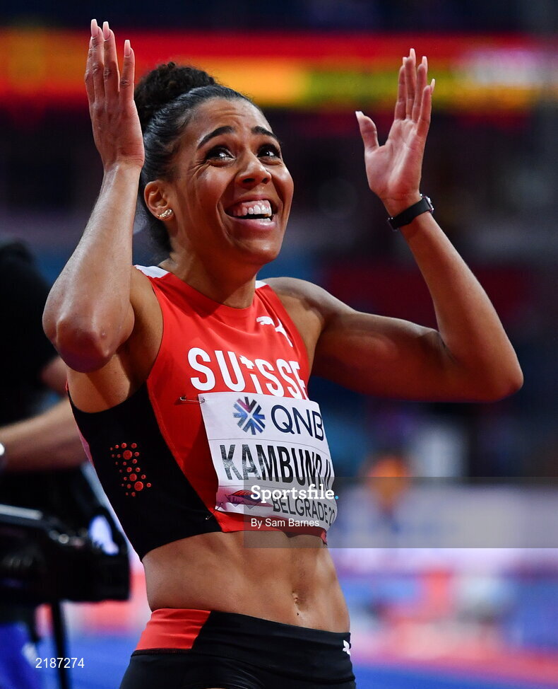 18 March 2022; Mujinga Kambundji of Switzerland celebrates winning the women's 60m final during day one of the World Indoor Athletics Championships at the Štark Arena in Belgrade, Serbia. Photo by Sam Barnes/Sportsfile