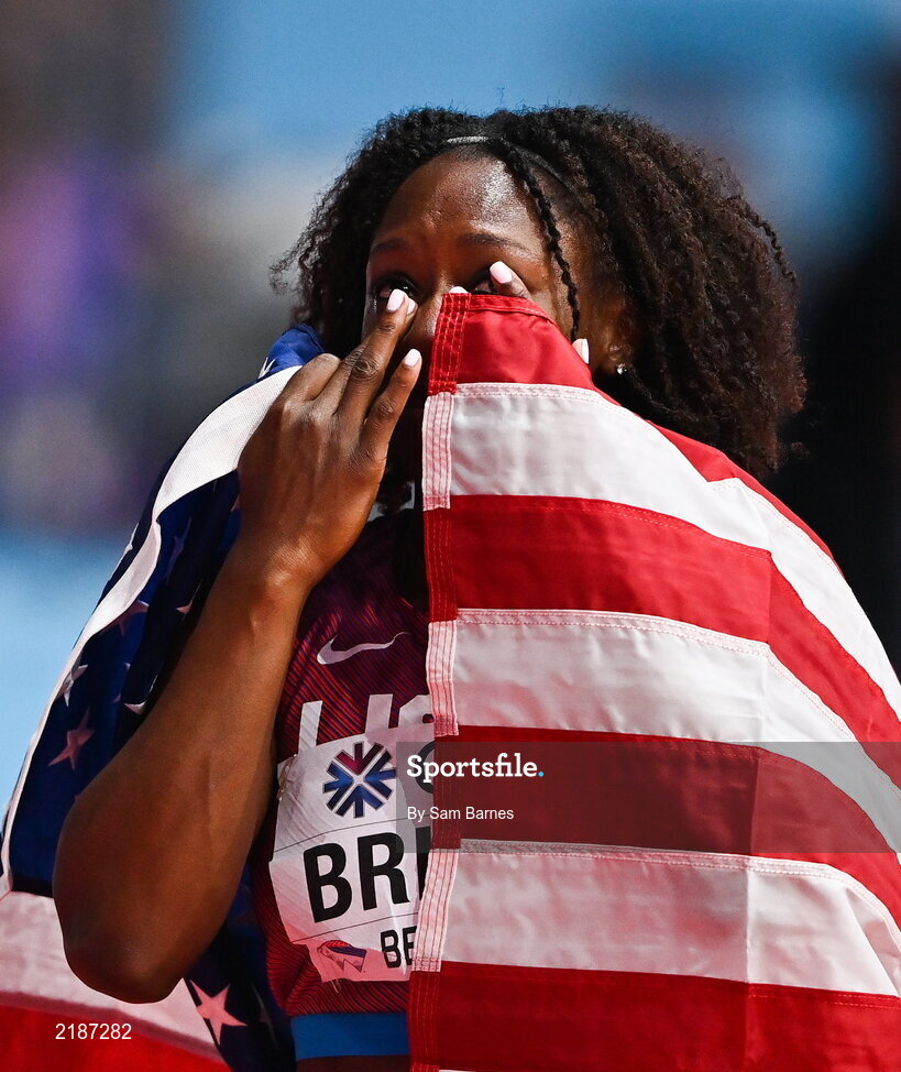 18 March 2022; Mikiah Brisco of USA after finishing second in the women's 60m final during day one of the World Indoor Athletics Championships at the Štark Arena in Belgrade, Serbia. Photo by Sam Barnes/Sportsfile