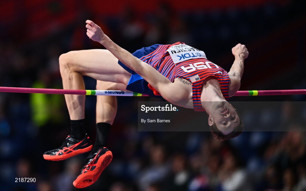 18 March 2022; Steven Bastien of USA competing in the high jump of the men's Heptathlon during day one of the World Indoor Athletics Championships at the Štark Arena in Belgrade, Serbia. Photo by Sam Barnes/Sportsfile