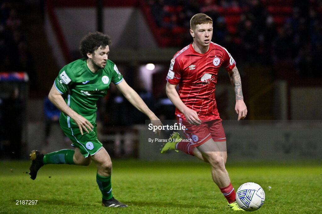 18 March 2022; Kameron Ledwidge of Shelbourne in action against Barry McNamee of Finn Harps during the SSE Airtricity League Premier Division match between Shelbourne and Finn Harps at Tolka Park in Dublin. Photo by Piaras Ó Mídheach/Sportsfile