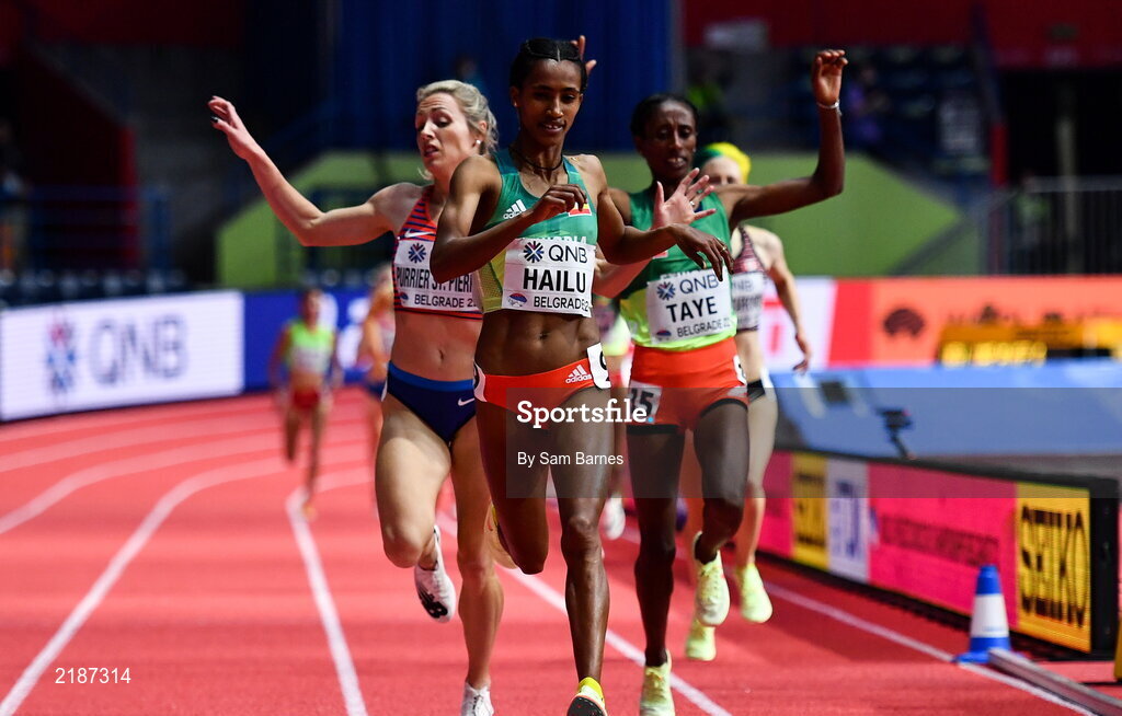 18 March 2022; Lemlem Hailu of Ethiopia, centre, crosses the line to win the women's 3000m final during day one of the World Indoor Athletics Championships at the Štark Arena in Belgrade, Serbia. Photo by Sam Barnes/Sportsfile