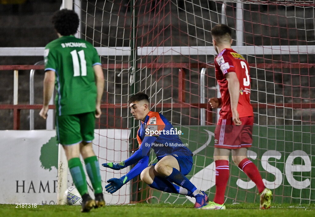 18 March 2022; Shelbourne goalkeeper Lewis Webb is beaten by a shot by Ethan Boyle, not pictured, for the first goal for Finn Harps during the SSE Airtricity League Premier Division match between Shelbourne and Finn Harps at Tolka Park in Dublin. Photo by Piaras Ó Mídheach/Sportsfile