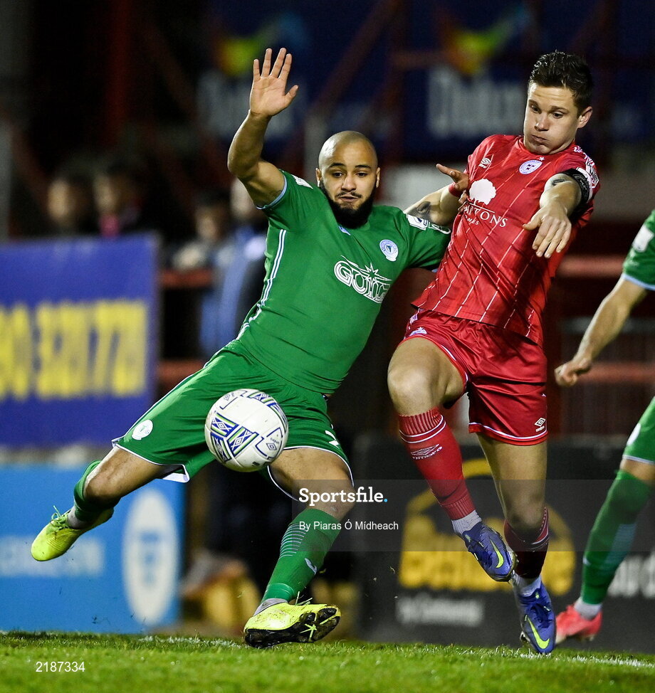 18 March 2022; Ethan Boyle of Finn Harps in action against Luke Byrne of Shelbourne during the SSE Airtricity League Premier Division match between Shelbourne and Finn Harps at Tolka Park in Dublin. Photo by Piaras Ó Mídheach/Sportsfile