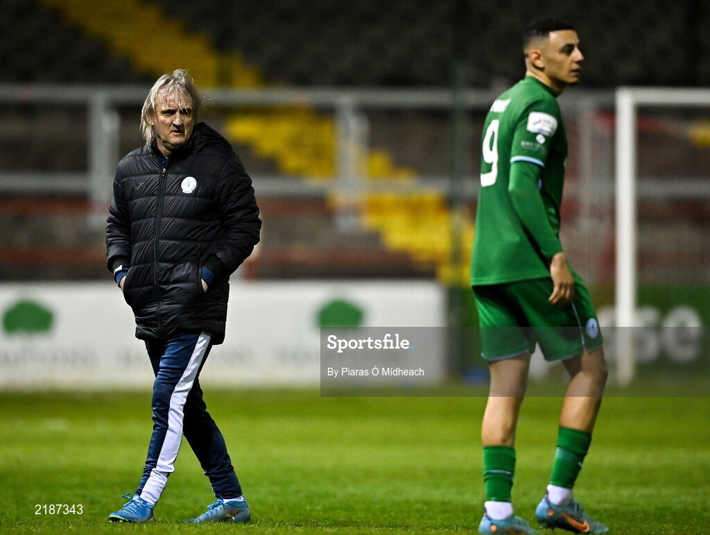 18 March 2022; Finn Harps manager Ollie Horgan with Yoyo Mahdy at half-time during the SSE Airtricity League Premier Division match between Shelbourne and Finn Harps at Tolka Park in Dublin. Photo by Piaras Ó Mídheach/Sportsfile