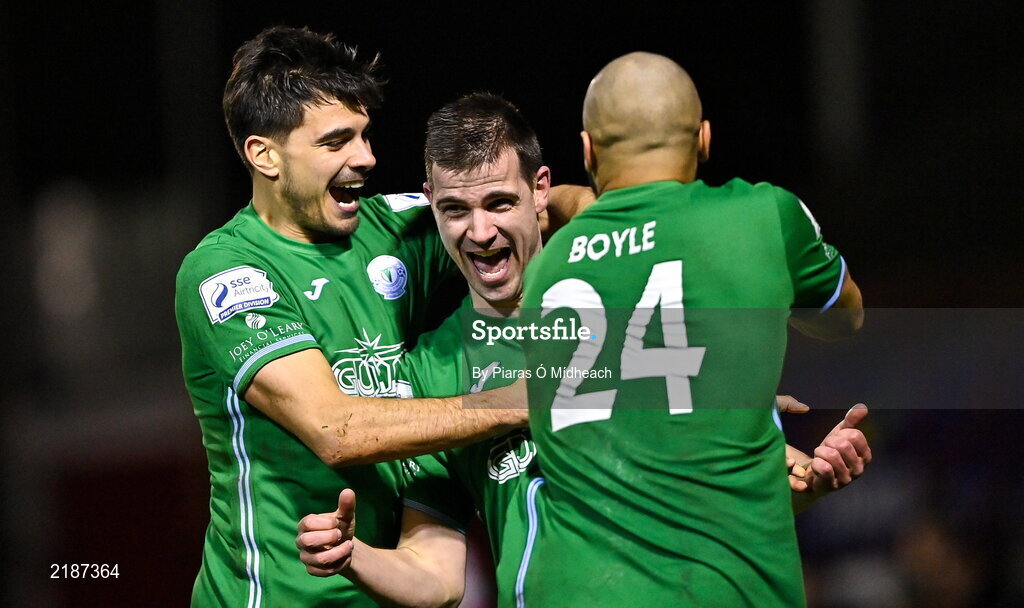 18 March 2022; Conor Tourish of Finn Harps, centre, celebrates with teammates Filip Mihaljevic of Finn Harps, left, and Ethan Boyle after scoring his side's second goal during the SSE Airtricity League Premier Division match between Shelbourne and Finn Harps at Tolka Park in Dublin. Photo by Piaras Ó Mídheach/Sportsfile