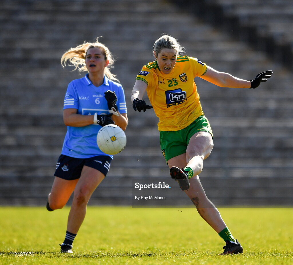 19 March 2022; Yvonne Bonnar of Donegal kicks a point under pressure from Martha Byrne of Dublin during the Lidl Ladies Football National League Division 1 Semi-Final match between Dublin and Donegal at St Tiernach's Park in Clones, Monaghan. Photo by Ray McManus/Sportsfile