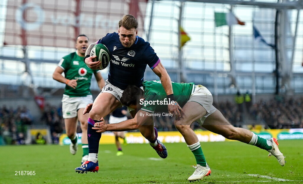 19 March 2022; Stuart Hogg of Scotland is tackled by Hugo Keenan of Ireland during the Guinness Six Nations Rugby Championship match between Ireland and Scotland at Aviva Stadium in Dublin. Photo by Ramsey Cardy/Sportsfile