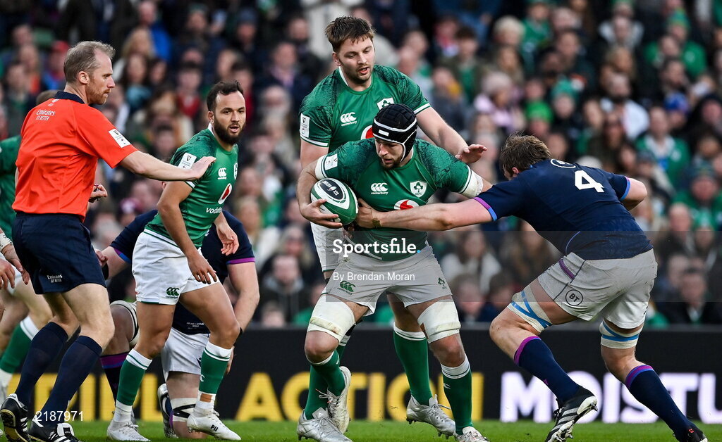 19 March 2022; Caelan Doris of Ireland is tackled by Jonny Gray of Scotland during the Guinness Six Nations Rugby Championship match between Ireland and Scotland at Aviva Stadium in Dublin. Photo by Brendan Moran/Sportsfile